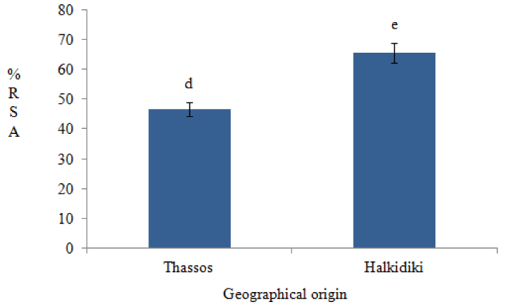 Results showed that, there were recorded variations in %RSA values among samples of the same and different geographical origin. More specifically, pine honey samples from Thassos region had lower %RSA values than those from Halkidiki region. Statistical analysis showed that these differences were statistically significant (p<0.001) (Figure 3).