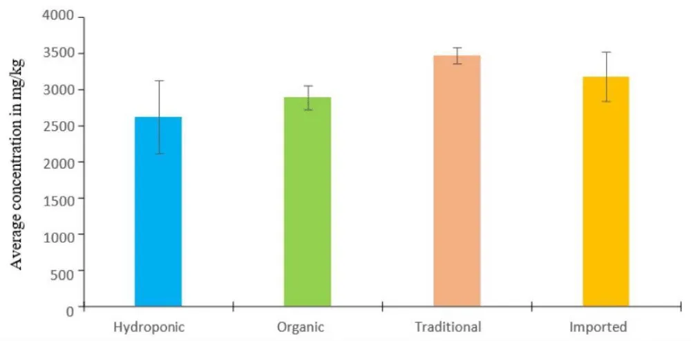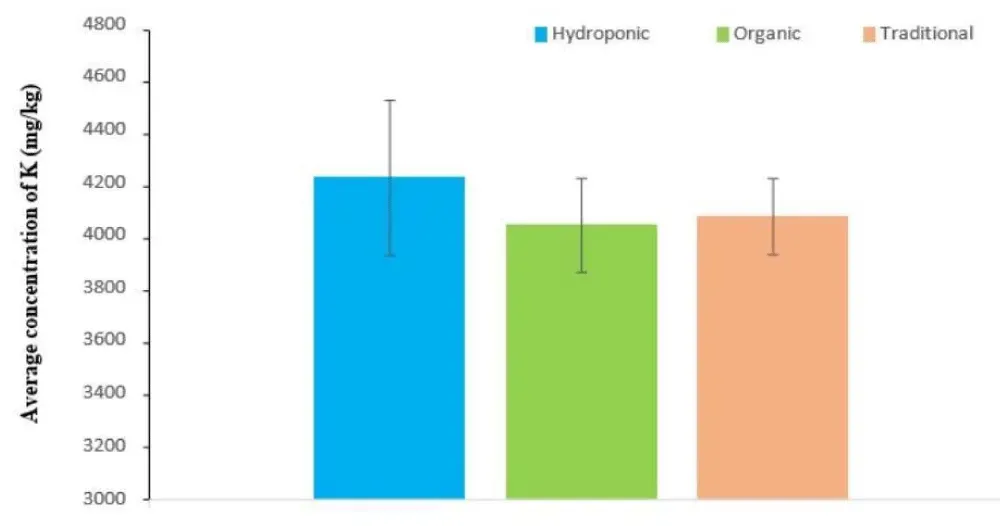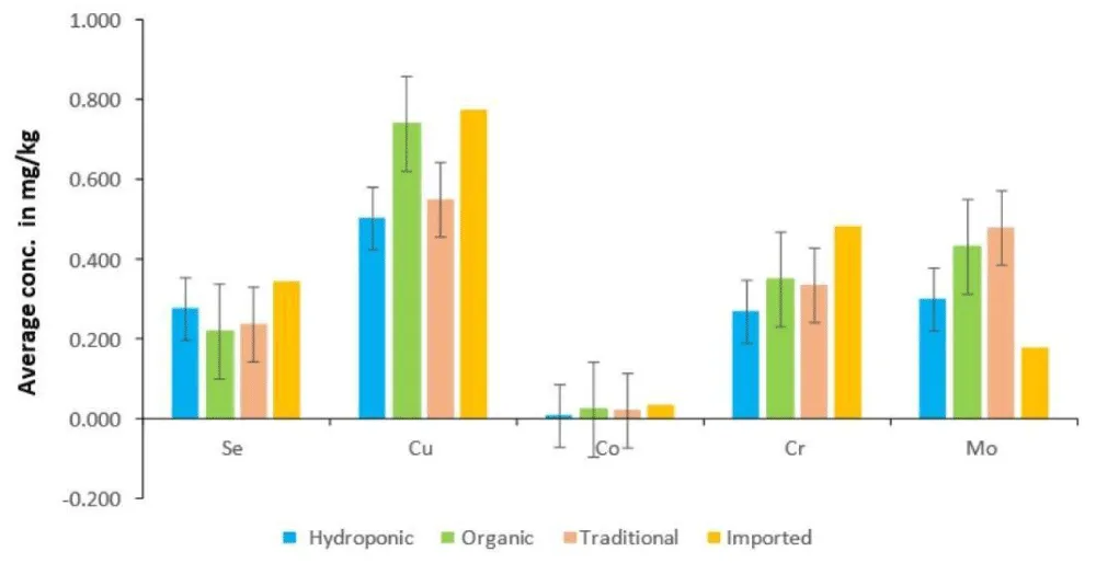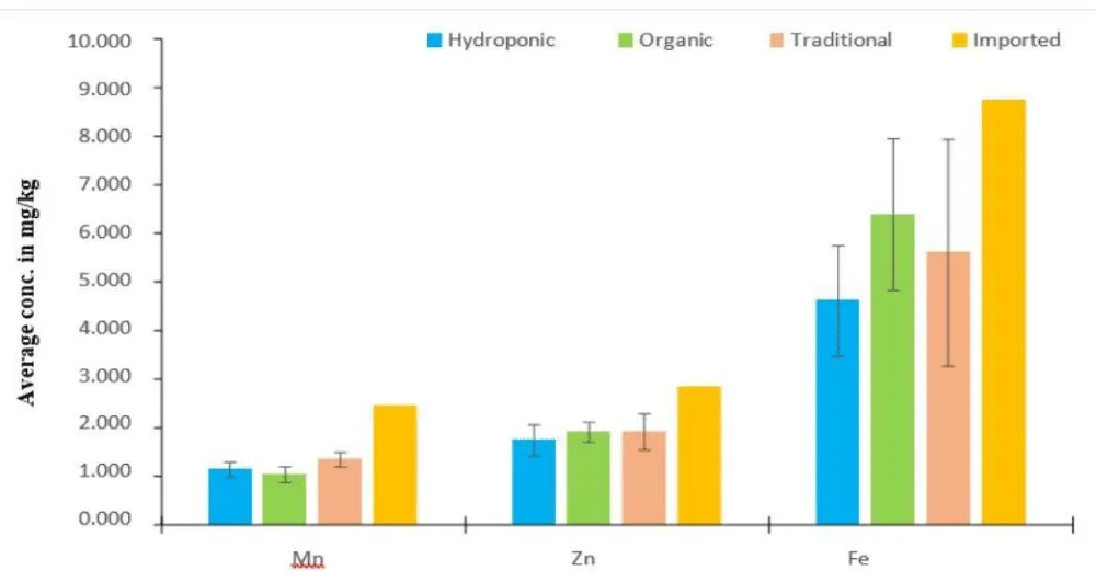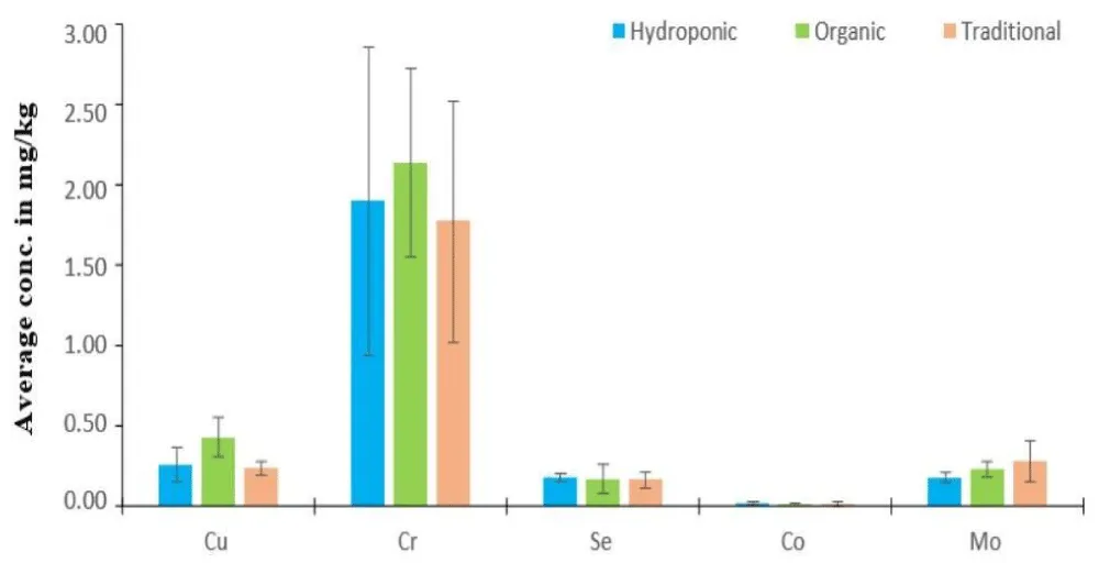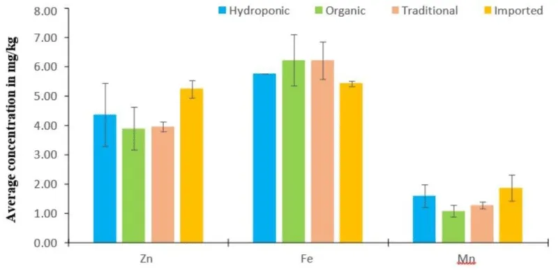 Results: There was little variation in vegetable nutrient content among the different farming techniques. Organic and hydroponic systems yielded vegetables with comparable levels of water and potassium, calcium, magnesium, and trace elements including zinc, iron copper and selenium to conventional soil-grown vegetables. Additionally, levels of toxic heavy metals such as lead, cadmium, mercury and arsenic were low and similar across cultivation methods.