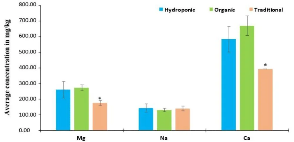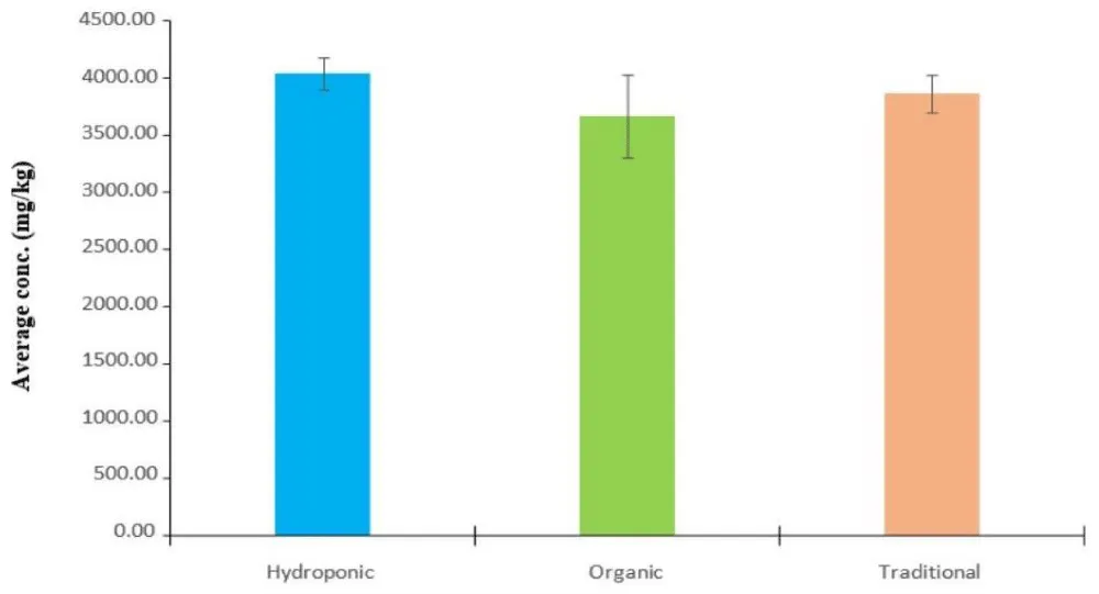 Conclusion: The findings indicate that mineral concentrations in vegetables were broadly comparable across hydroponic, organic, and traditional farming systems. These results suggest that, despite differences in cultivation practices, alternative production systems can achieve similar nutritional quality in terms of mineral content and support the use of hydroponic and organic systems as viable strategies for vegetable production in regions with limited arable land, such as Saudi Arabia, without compromising mineral nutrient availability.