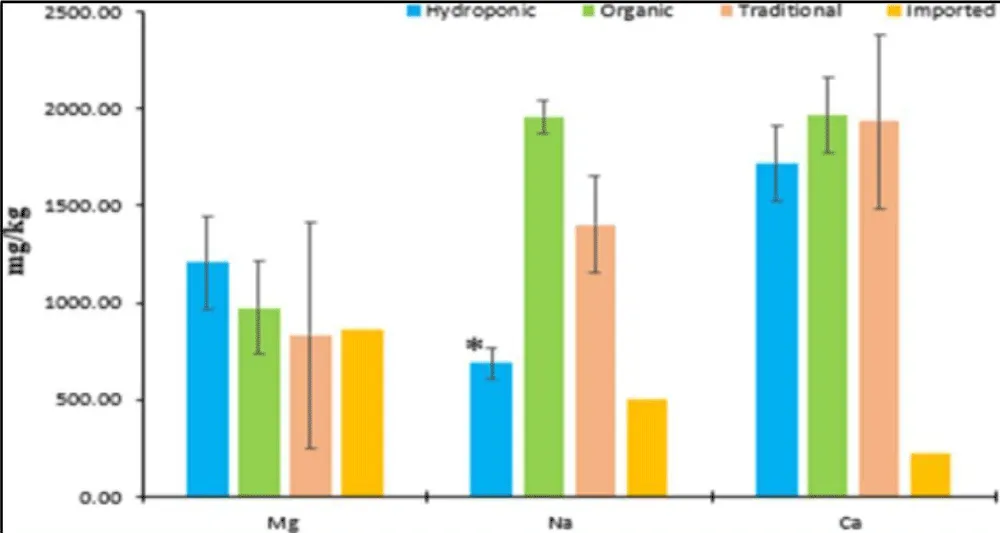 Figure 2: Average concentrations (mg/kg dry weight ± sem) of Mg, Na, and Ca levels in cucumbers produced by different farming methods. *Denotes significantly different (p < 0.05).