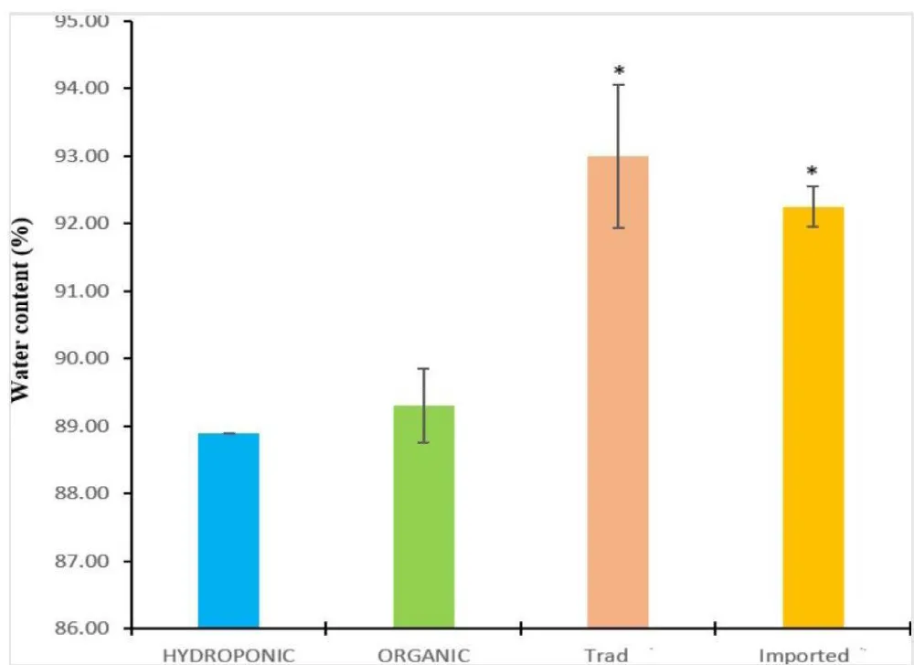 Figure 9: Average water content (%) in peppers from different farming techniques. *Values are significantly different from organic and hydroponic growing peppers (p < 0.05).